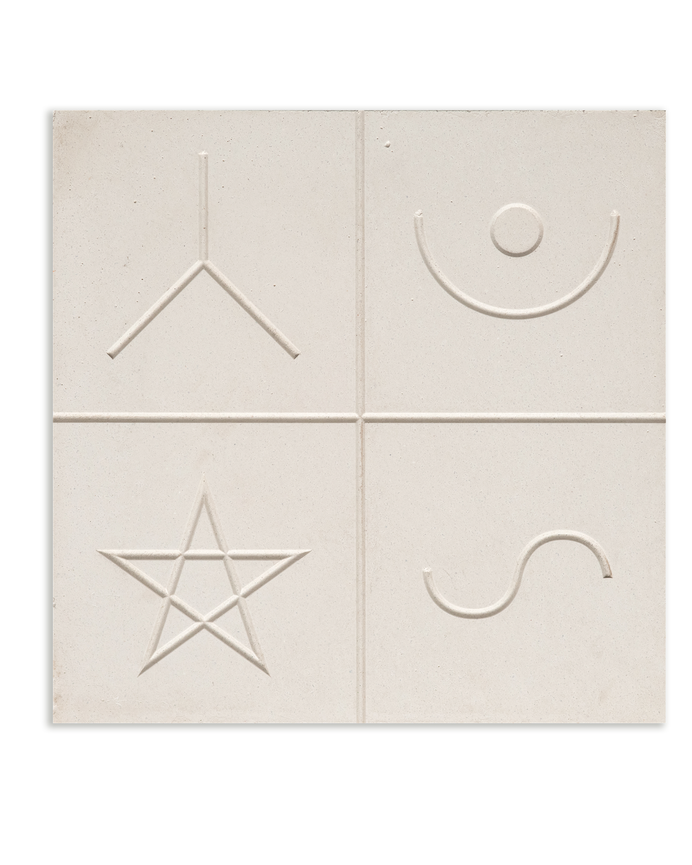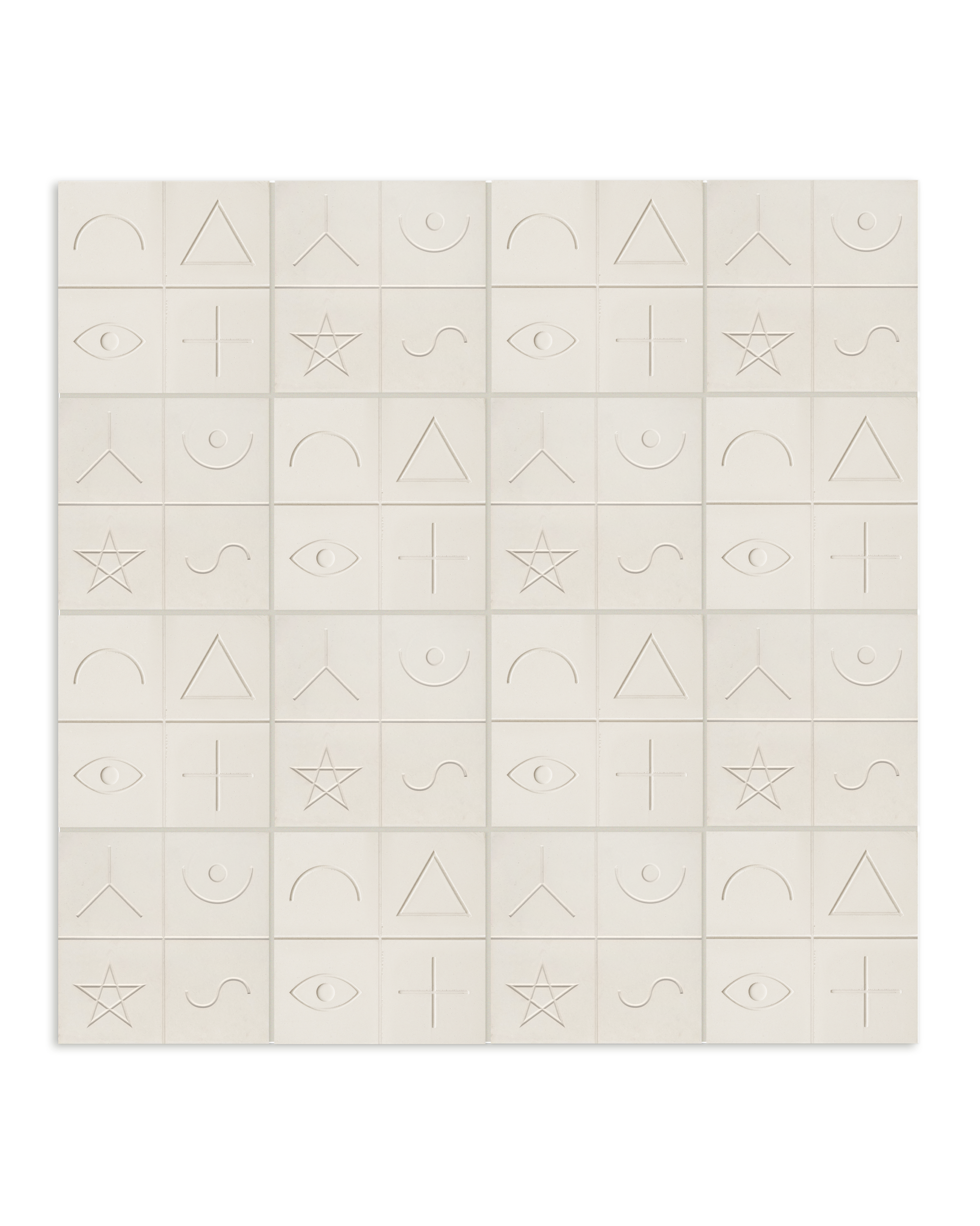 Argot takes its name from the linguistic term for coded jargon—and its inspiration from a secret language carved into history. In the 19th and 20th centuries, transient workers left cryptic symbols on fences, walls, and under bridges: warnings of danger, promises of opportunity. The collection combines these "hobo code" marks with ancient petroglyphs, runes, and meteorological symbols—a motif that interprets both mystery and archaeology. Argot is available in five colorways: Black, Blue, Blush, Terra Cotta, and White. The encaustic tiles are made for residential or commercial wall applications, and can be installed with or without grout. |